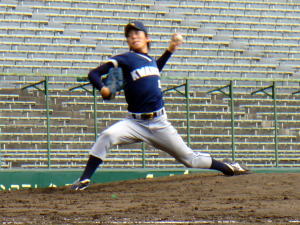 (写真:3安打完封で今季初勝利を挙げた関学大・宮西)