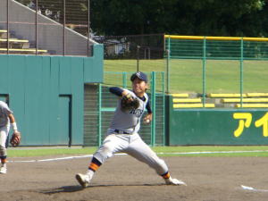 (写真:無安打無得点試合を達成した立命大・金刃)