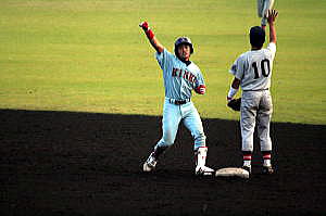(写真:7回、逆転の左中間二塁打を放ちガッツポーヅをする南)