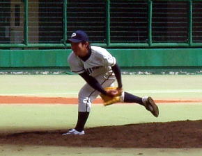 (写真:完封で今季初勝利を挙げた同大・佐川)