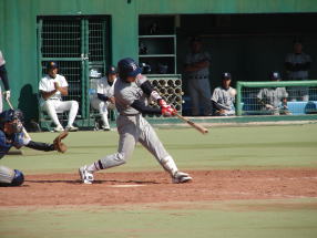 立命は1点を追う4回、1死一、二塁から釜谷(4・社)の左越本塁打で逆転。その後1点を返されるも、釜谷の今試合2本目の本塁打などで確実に加点し、関学を突き放した。