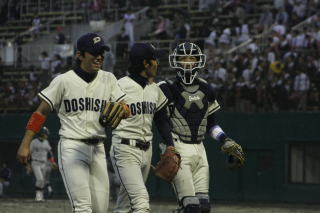 【写真:立命打線を封じた同大守備陣(左から森川、平川、小林)】