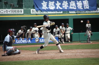 京大は5回、連打と四球で満塁の好機を作り、押し出しで先制点を奪うと、大背戸(3・北野)の内野安打となるスクイズ、久保津(4・小野)の2点適時打で一挙4得点に成功した。