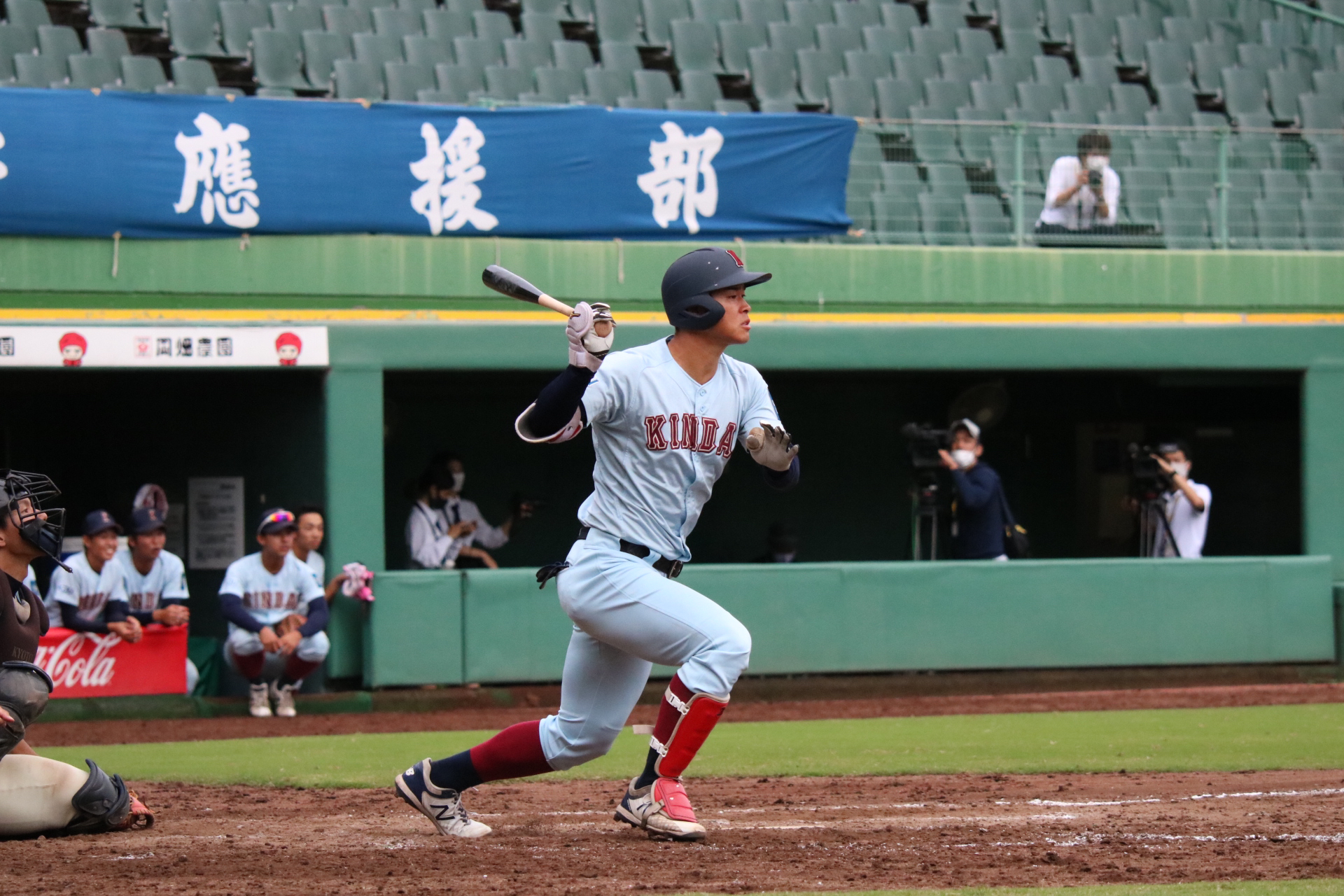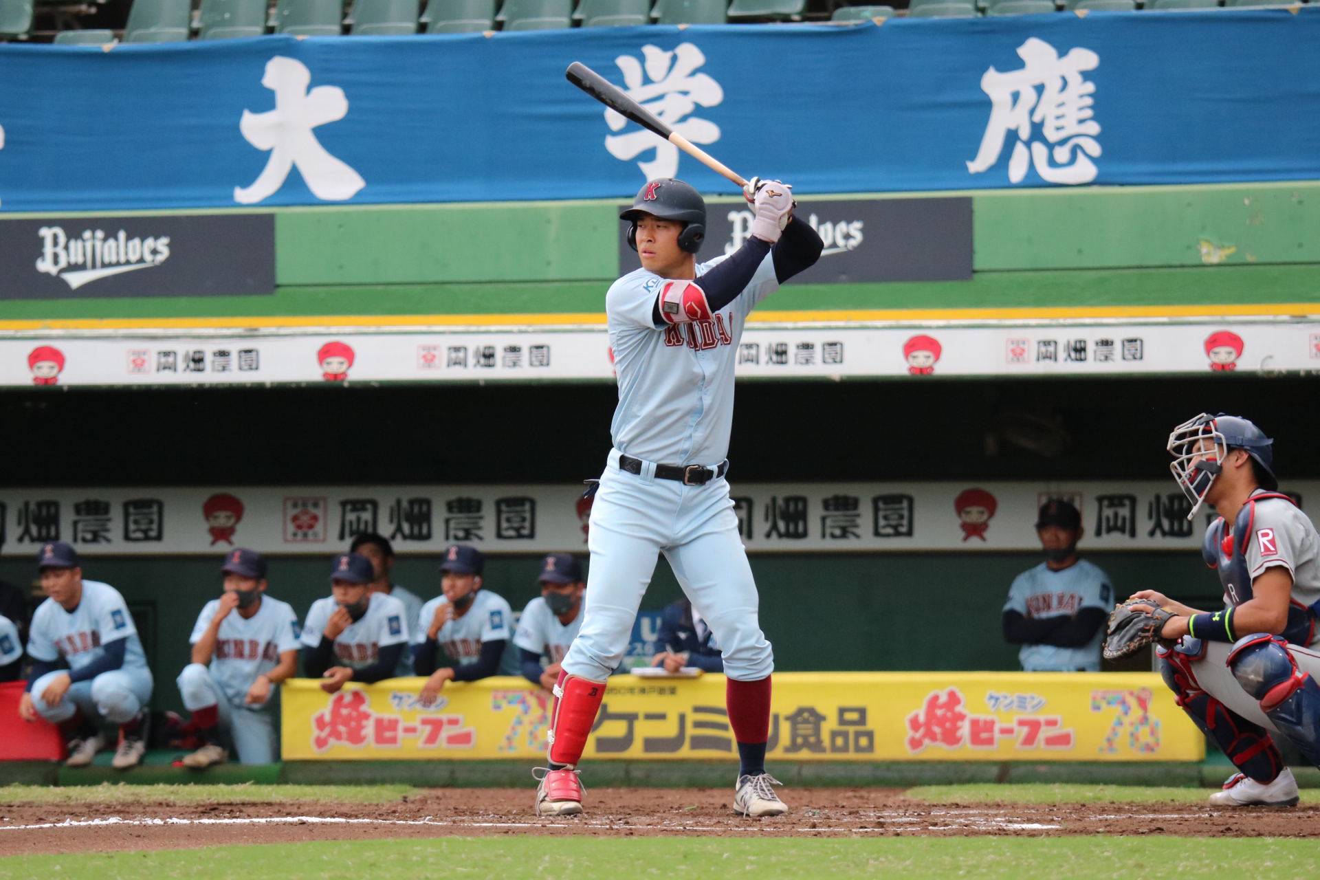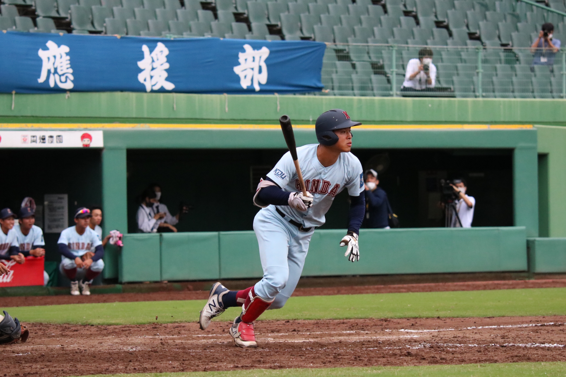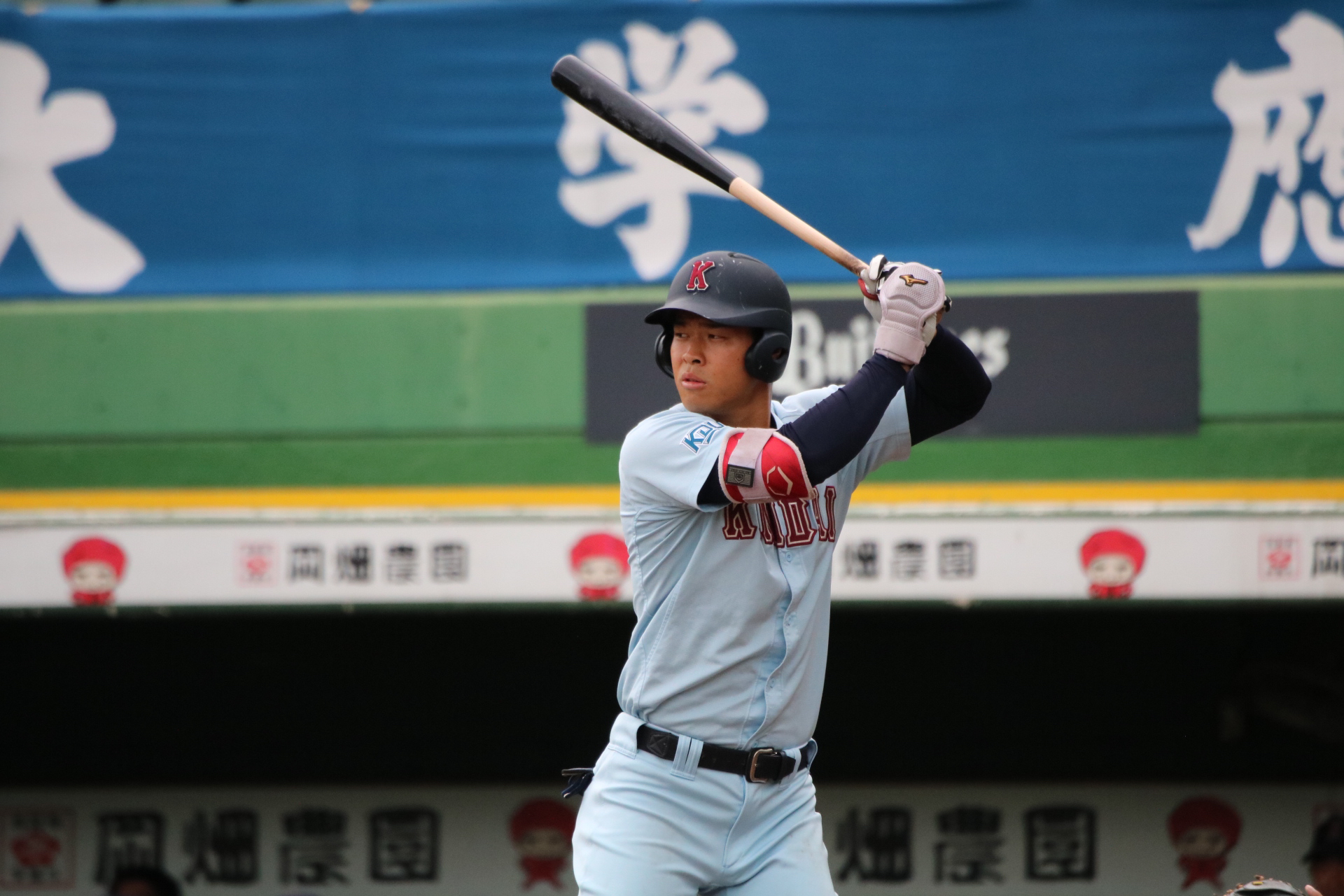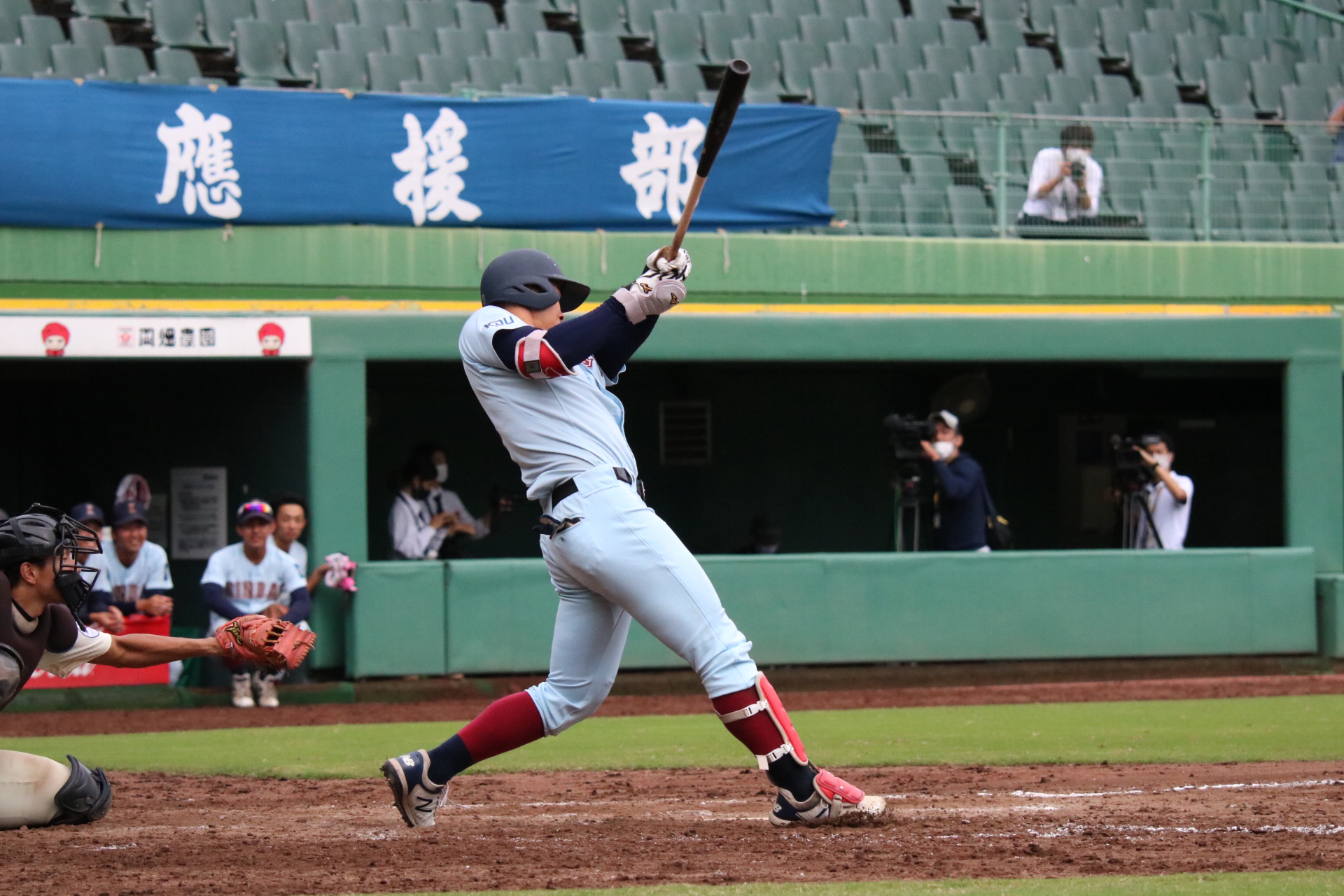 近大の主砲、佐藤(4・仁川学院)が 新リーグ通算本塁打記録となる、リーグ戦通算14本塁打を達成した。 佐藤は1年秋から強力打線の主軸を担い、 コンスタントに本塁打を積み重ねてきた。 また2018には大学日本代表に選出、 さらに2018秋には最優秀選手賞、 2018春・秋、2019春と三度のベストナイン獲得。 主砲として着実と結果を残してきた。 最多記録に王手をかけて挑んだ関大との一戦(10/18、第6節1回戦)、 延長タイブレーク11回、 先頭で右方向に大きな3ラン本塁打を放ち 記録達成を飾った。 二岡智宏(現・ジャイアンツ三軍監督)が持つ連盟記録 通算13本塁打を越えた。 この男の今後の活躍から目が離せない。 |
